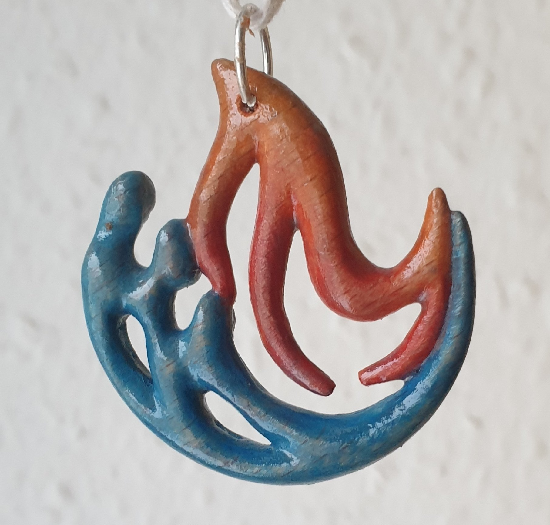 Этот кулон в красноватых и голубоватых тонах символизирует связь стихий «огонь и вода». Как и все наши произведения искусства, кулон изготовлен вручную из цельного куска дерева и, несомненно, является уникальным филигранным изделием.